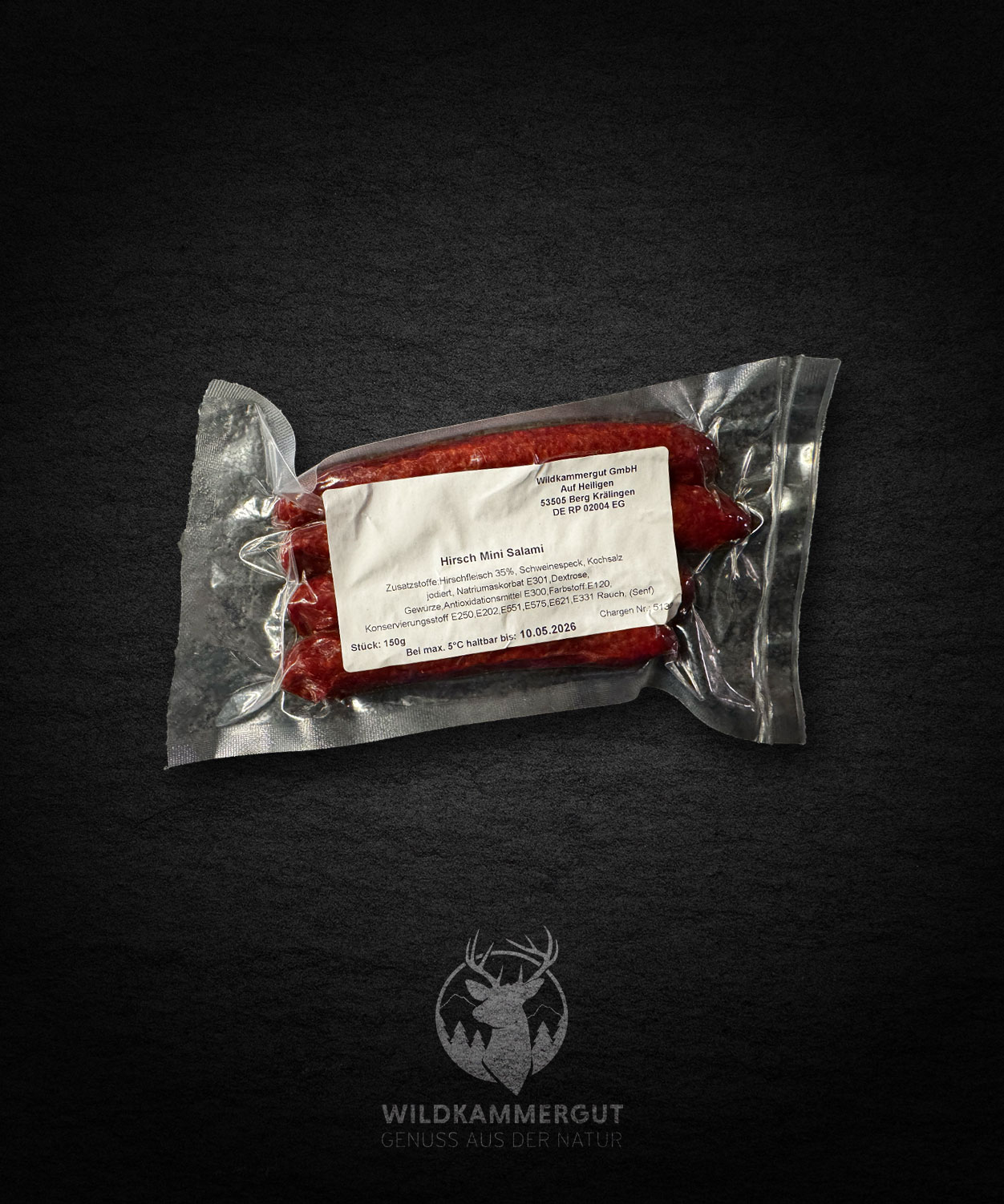 Die Verpackung enthält 4 Hirsch Mini Salami mit 35 % Hirschfleisch